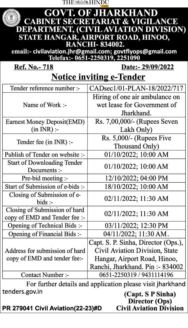 Tender for Hiring of one air ambulance on wet lease for Government of Jharkhand.