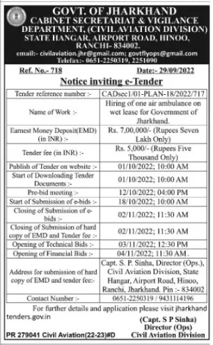Tender for Hiring of one air ambulance on wet lease for Government of Jharkhand.
