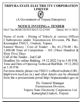 Tender For Hiring of Vehicle at various Offices I Substations under Transmission Division, PK Bari, Kumarghat TSECL, Unakoti, Tripura.