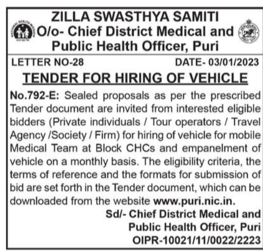 Tender for hiring of vehicle for mobile Medical Team at Block CHCS and empanelment of vehicle on a monthly basis.