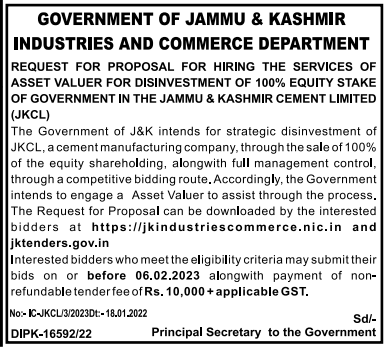 Tender for REQUEST FOR PROPOSAL FOR HIRING THE SERVICES OF ASSET VALUER FOR DISINVESTMENT OF 100% EQUITY STAKE OF GOVERNMENT IN THE JAMMU & KASHMIR CEMENT LIMITED (JKCL)