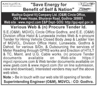 TENDER FOR Hiring Vehicle Closed Body Jeep & Ladder Van of MGVCL, Division Office Halol, Lunawada, Godhra & Dahod. for various S/Dn. & Outsourcing the services of Meter Reading through GPRS works and Erection of HT/LT & TC, Maint. and U.G. Cable works. (n) procure Tender documents available