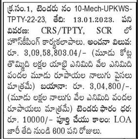 Tender for Housekeeping activities in CRS/TPTY, SCR.