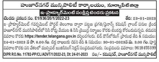 Tenders are invited for laying of CC Roads & Construction of CC Drains in Huzur Nagar Municipality under