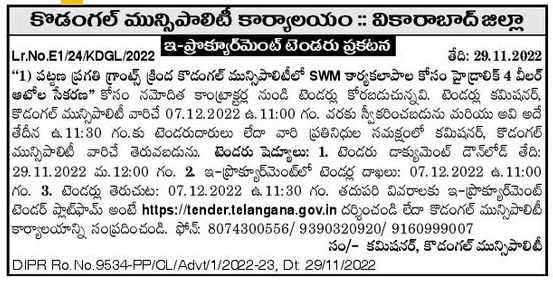 Tender for Hydraulic 4 Wheeler Autos for SWM activities in Kodangal Municipality under Urban Development Grants”.