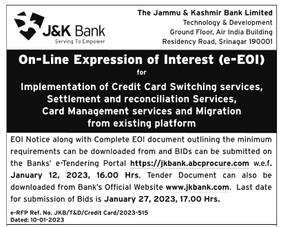 Tender for Implementation of Credit Card Switching services, Settlement and reconciliation Services, Card Management services and Migration from existing platform