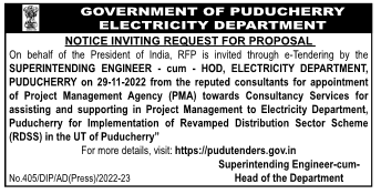 consultants for appointment of Project Management Agency (PMA) towards Consultancy Services for assisting and supporting in Project Management to Electricity Department, Puducherry for Implementation of Revamped Distribution Sector Scheme (RDSS) in the UT of Puducherry”
