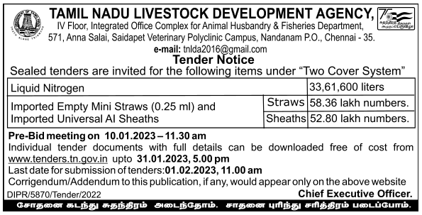 Tender for Imported Empty Mini Straws (0.25 ml) and Imported Universal Al Sheaths