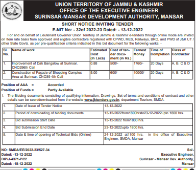 Tender for Improvement of Dak Bangalow at Surinsar. CNO296th Call