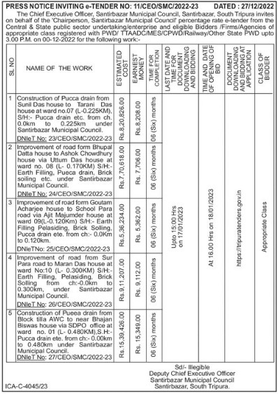 Tender for Improvement of road form Bhupal Datta house to Ashok Chowdhury house via Uttum Das house at ward no. 08 (L- 0.170KM) S/H:- Earth Filling. Pueca drain, Brick soiling etc. under Santirbazar Municipal Council. DNIeT No: 24/CEO/SMC/2022-23