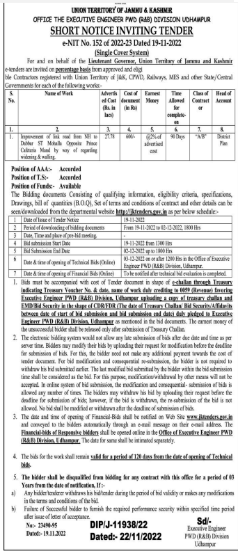 Tender for Improvement of road Opposite from NH to Prince The animal ST Mohalla Cafeteria Mand by way of regarding widening & walling