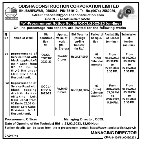 Tender for Improvement of Service Road with black topping distributaries offtaking Left Main Canal from 00 Km to 32,00 Km under Left Canal Division No.1, Kusumkhunti.
