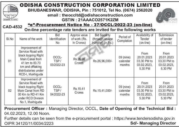 Tender for Improvement of Service Road with black topping Right Main Canal from 41 km to 83.70 km and offtaking distributaries under RCD-I, Mukhiguda