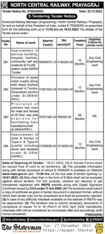 Tender for Improvement of toilet & kitchen in Type-II & Type-III quarter including doors and windows under Sr.DEN/ IV/PRYJ