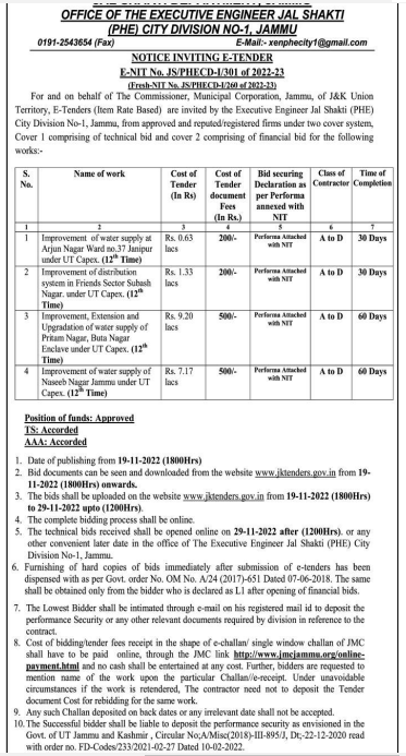 Tender for Improvement of water supply at Arjun Nagar Ward no.37 Janipur under UT Capex. (12 Time)