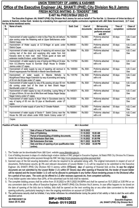Tender for Improvement of water supply by way of laying and fitting at GI pipe from S.C.Sharma house to Surinder Singh House to Greater Jammu under UT capex.