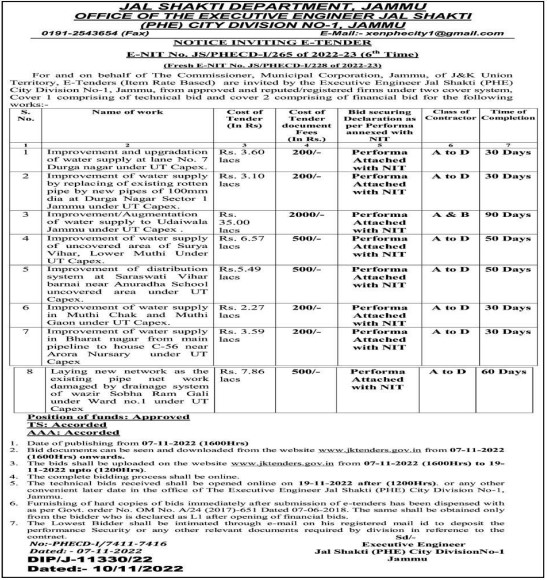 Tender for Improvement of water supply in Muthi Chak and Muthi Gaon under UT Capex.