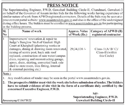 Improvement/ renovation & repair to Judge’s Bunglow No.8 of Gauhati High Court at Kharghull (plastering works or damages, dining & drawing room renovated, raising of sentry post, back side roof replaced, construction of rain water/campus drain, repairing and reconstructing garage, apron, drain, skirting, converted back side shed to store room, tiles fitting, internal & external painting etc.)