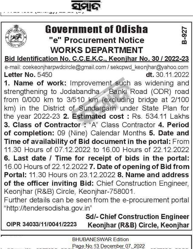 Tender for Improvement such as widening and strengthening to Jodabandha – Banki Road (ODR) road from 0/000 km to 3/510 km (excluding bridge at 2/100 km) in the District of Sundargarh under State Plan for the year 2022-23