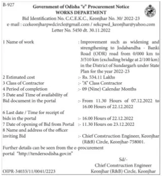 Tender for Improvement such as widening and strengthening to Jodabandha Banki Road (ODR) road from 0/000 km to 3/510 km (excluding bridge at 2/100 km) in the District of Sundargarh under State Plan for the year 2022-23