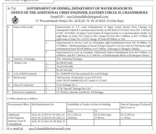 Tender for Improvement to 1-C canal Embankment of lapur Canal System from Champa to Sasanapada Chhak & Communication facility on left Bank of IE Disty From RD 1365km to RD. 10.562Km, of Jajpur Canal System & Improvement to Communication facility on right Bank on Disty N3 Main of HLC Range III from RD 1.300Km. to RD 7.60Km & right bank of Disty No of HLC Range from RD 00Km, to Tail