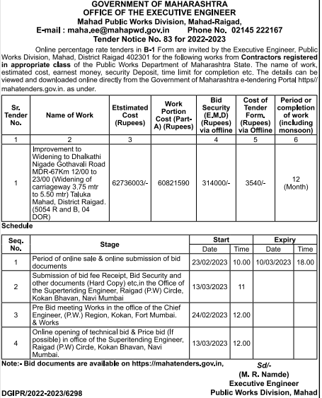 Tender for Improvement to Widening to Dhalkathi Nigade Gothavali Road MDR-67Km 12/00 to 23/00 (Widening of carriageway 3.75 mtr to 5.50 mtr) Taluka Mahad, District Raigad. (5054 R and B, 04 DOR)
