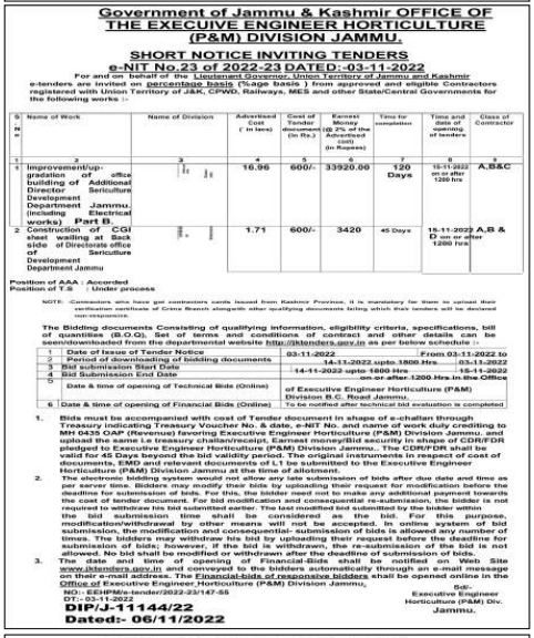 Tender for improvement/up. gradation of office building of Additional Director Sericultural Development Department Jammu Electrical (including works) Part в