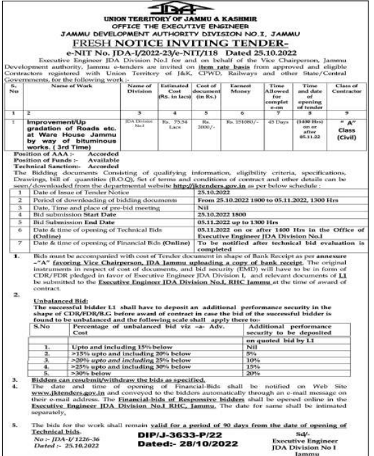 Tender for Improvement Up Rs. 75.54 Ha 151000/- 45 Days “A” Class (Civil) gradation of Roads etc. at Ware House Jammu by way of bituminous works. (3rd Time)