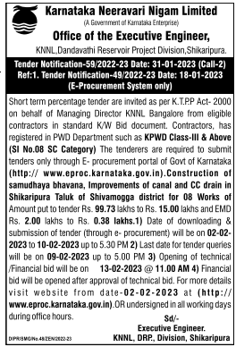 Tender for Improvements of canal and CC drain in Shikaripura Taluk of Shivamogga district for 08 Works