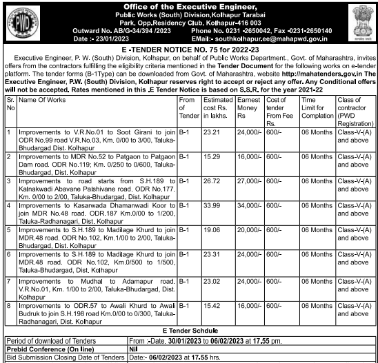 Tender for Improvements to MDR No.52 to Patgaon to Patgaon B-1 Dam road. ODR No.119; Km. 0/250 to 0/600, Taluka-Bhudargad, Dist. Kolhapur