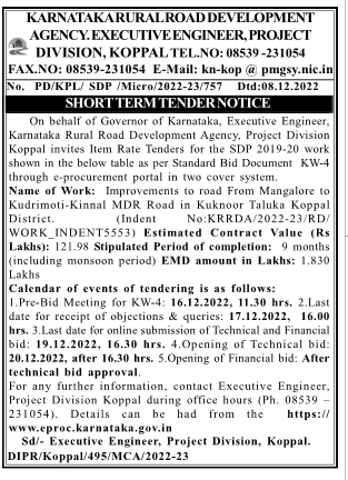 Tender for Improvements to road From Mangalore to Kudrimoti-Kinnal MDR Road in Kuknoor Taluka Koppal District.