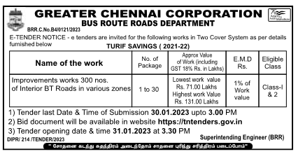 Tender for Improvements works 300 nos. of Interior BT Roads in various zones