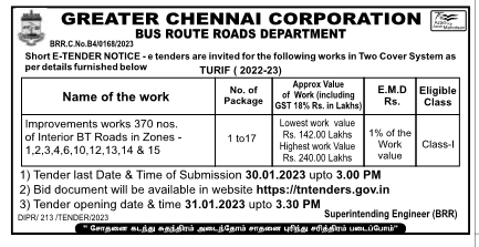 Tender for Improvements works 370 nos. of Interior BT Roads in Zones – 1,2,3,4,6,10,12,13,14 & 15