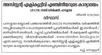 Tender for In Parassala Block Panchayat, E-tender is invited for 4 public works works to be implemented in the financial year 2022/23, ordinary tender and re-quotation for flood works