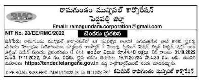Tender for in Ramagundam Municipal Corporation for one year: Portable Compactor 2 Nos., Sweeping Machine, Litter Picker, Suction and Jetting Machine and Vaikuntha Ratham (Work)