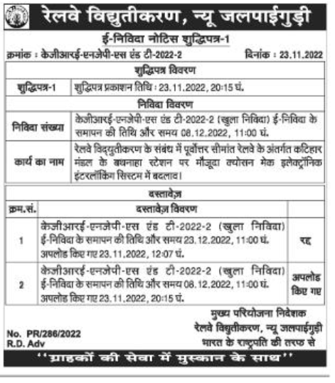 Tender For In relation to railway electrification, change in existing Kyoran make electronic interlocking system at Bathnaha station of Katihar division under Northeast Frontier Railway.