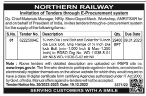Tender for % Inch Dia Lock Bolt and Collar for %4 Inch dia Lock Bolt. Grip Range of % Inch Dia lock Bolt (min=1.000 Inch & Max-1.250 Inch) to RDSO Drg No. WD-11036-S-01 Alt: Nil & WD-11036-S-02 alt: Nil