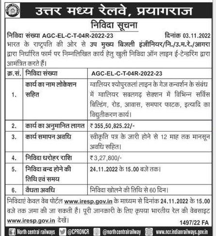 Tender for including Regarding gauge conversion of Gwalior Sheopurkalan line, various service buildings, roads, houses, level crossing gates, etc. in Gwalior Sabalgarh section. electrification work.
