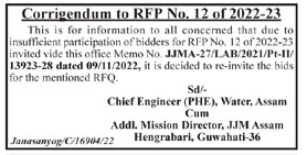 This is for information to all concerned that due to insufficient participation of bidders for RFP No. 12 of 2022-23 invited vide this office Memo No. JJMA-27/LAB/2021/Pt-II/ 13923-28 dated 09/11/2022,