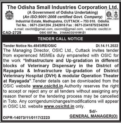 “Infrastructure and Up-gradation in different blocks of Veterinary Dispensary in the District of Rayagada & Infrastructure Up-gradation of District Veterinary Hospital (DVH) & modular Operation Theater at Rayagada”.