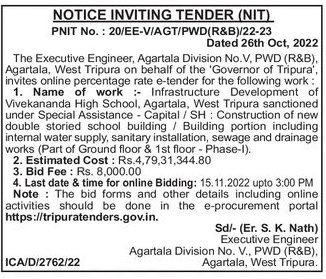 Tender for Infrastructure Development of Vivekananda High School, Agartala, West Tripura sanctioned under Special Assistance – Capital/SH: Construction of new double storied school building / Building portion including internal water supply, sanitary installation, sewage and drainage works (Part of Ground floor & 1st floor – Phase-I).