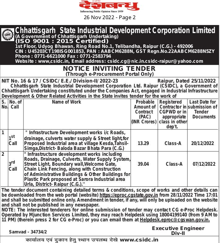Tender For Infrastructure development works including Roads, Drainage, Culverts, Water Supply System, Street Light, Boundary wall,Welcome Gate, Chain Link Fencing, along with Construction.