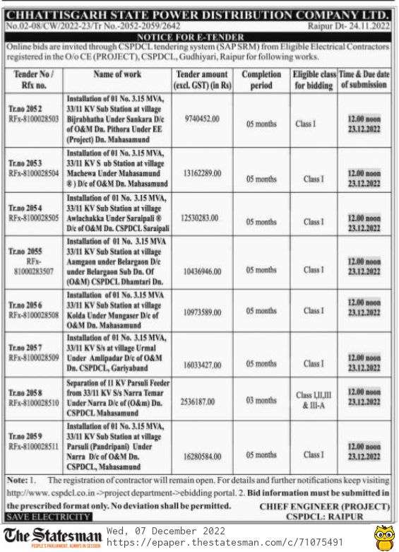 Tender for Installation of 01 No. 3.15 MVA, 33/11 KV Sub Station at village Parsuli (Pandripani) Under Narra D/c of O&M Dn. CSPDCL, Mahasamund