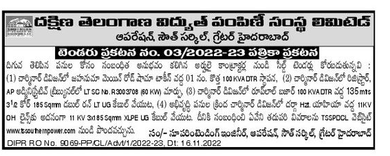 Tender for Installation of 01 No. New 100 KVA DTR at Charminar Division Jahanuma Main Road Shama Takin,