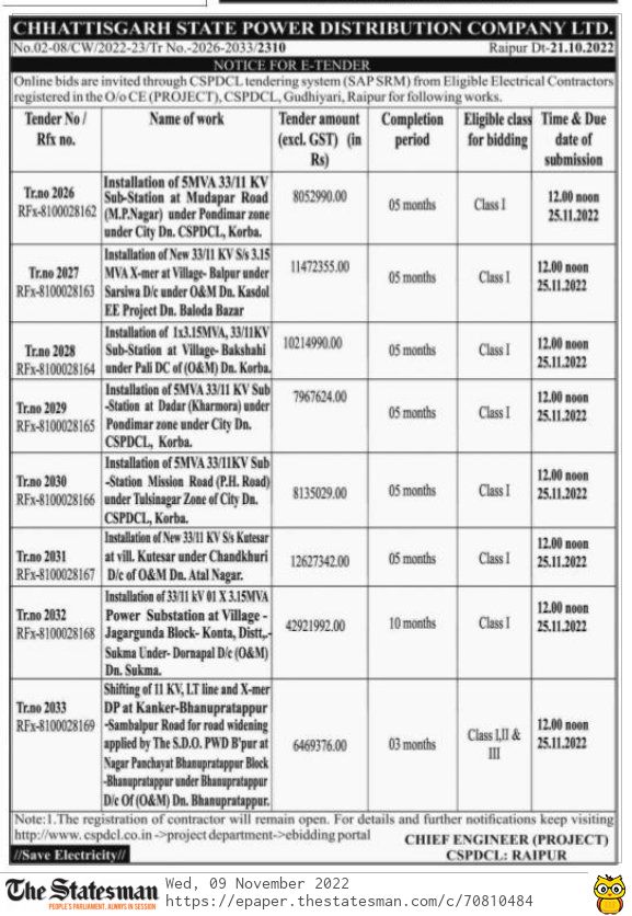 Tender for Installation of 1×3.15MVA, 33/11KV Sub-Station at Village-Bakshahi under Pali DC of (O&M) Dn. Korba