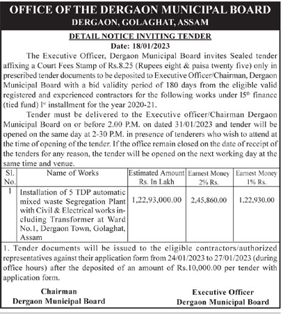 Tender for Installation of 5 TDP automatic mixed waste Segregation Plant with Civil & Electrical works in- cluding Transformer at Ward No.1, Dergaon Town, Golaghat, Assam