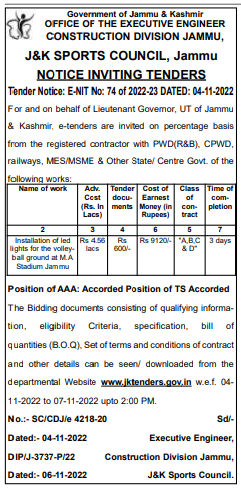 Tender for Installation of led lights for the volley- ball ground at MA Stadium Jammu