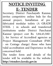Tender for Installation of pre- fabricated modular toilets (A GRADE STEEL) in schools and transferred institutions under District Panchayat Kannur