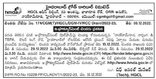 Tender for Installation of RCC Drain Covers and Repairs to Drains at Rotaries at Nanakjguda, Narsinghi & TSPA, Outer Ring Road, Hyderabad.
