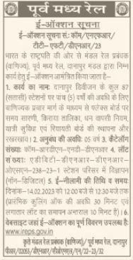 East Central Railway E-Auction Notice E-Auction Notice from Comm/NFR/TTFT/DNR/23 On behalf of the President of India, Divisional Railway Manager (Commercial), East Central Railway, Danapur Nal invites e-Auction for the following work- 1. Name of work: Installation of time table, fare table, refund rules, passenger convenience and concessional fare on flex board through Kanijyak Prachar Marg for a period of five (5) years at total 87 (eighty seven) stations of Danapur Division AND MAINTENANCE